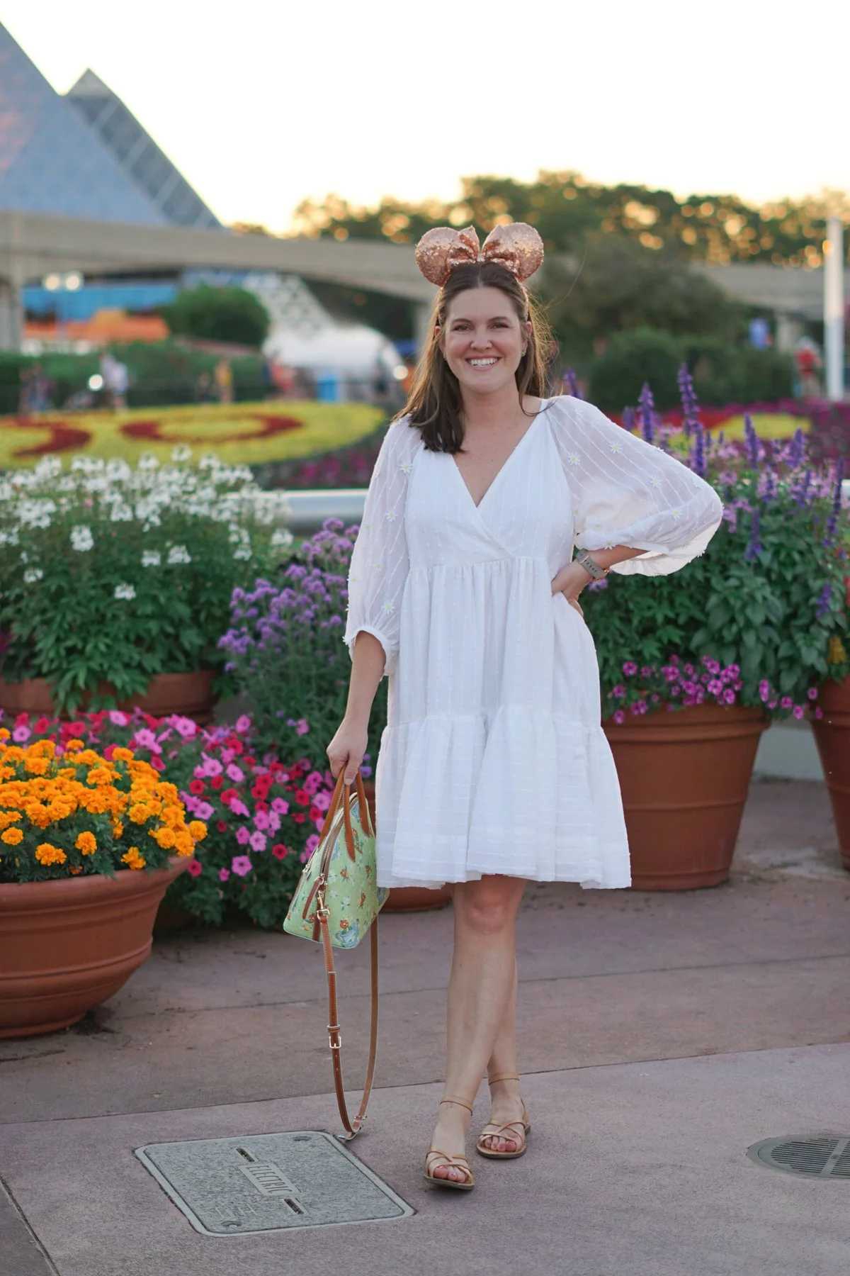 MODIFICATIONS: I lined the bodice and skirt (my fabric was very sheer - see the sleeves that I left unlined). For the additional gathered tier at the bottom, I cut the original skirt length by half and then doubled the width. I also added daisy trim to the sleeves and plan to sew tiny yellow beads in the center (more on that soon!)